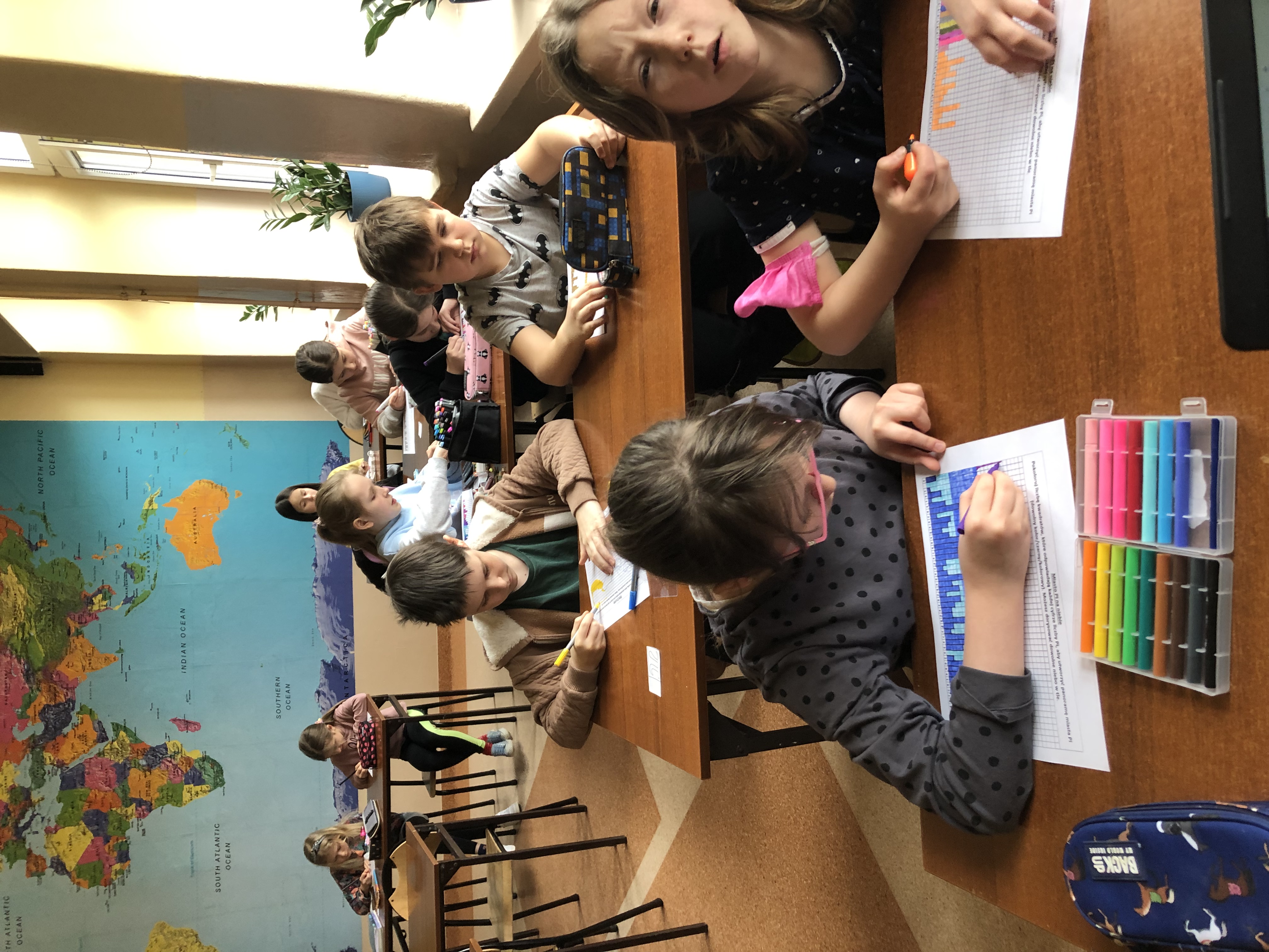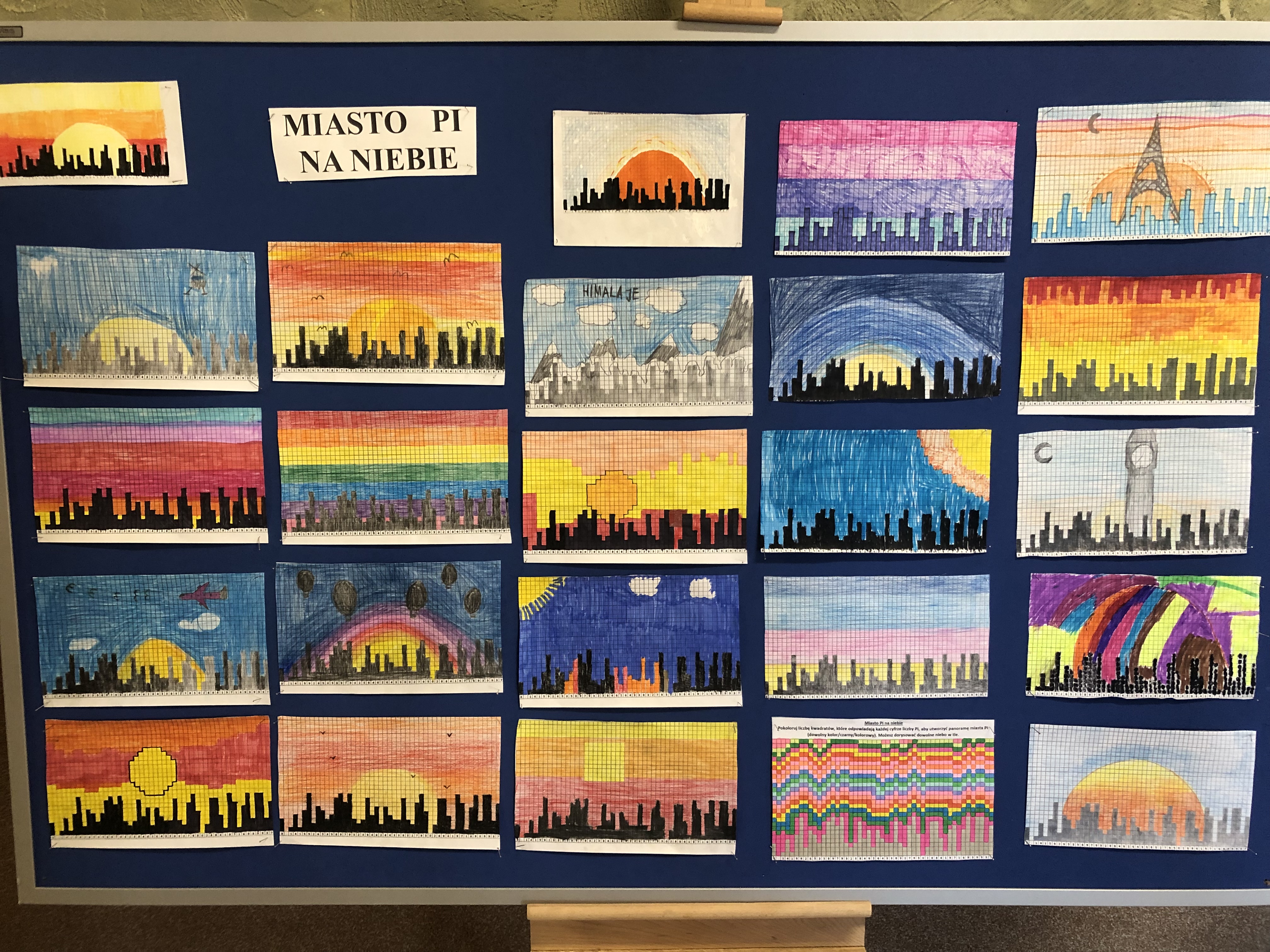 W ramach obchodów Dnia Liczby Pi w naszej szkole uczniowie przygotowali piękne prace plastycze. Pokolorowali liczbę kwadratów, które odpowiadają każdej cyfrze liczby Pi, aby utworzyć panoramę miasta Pi.