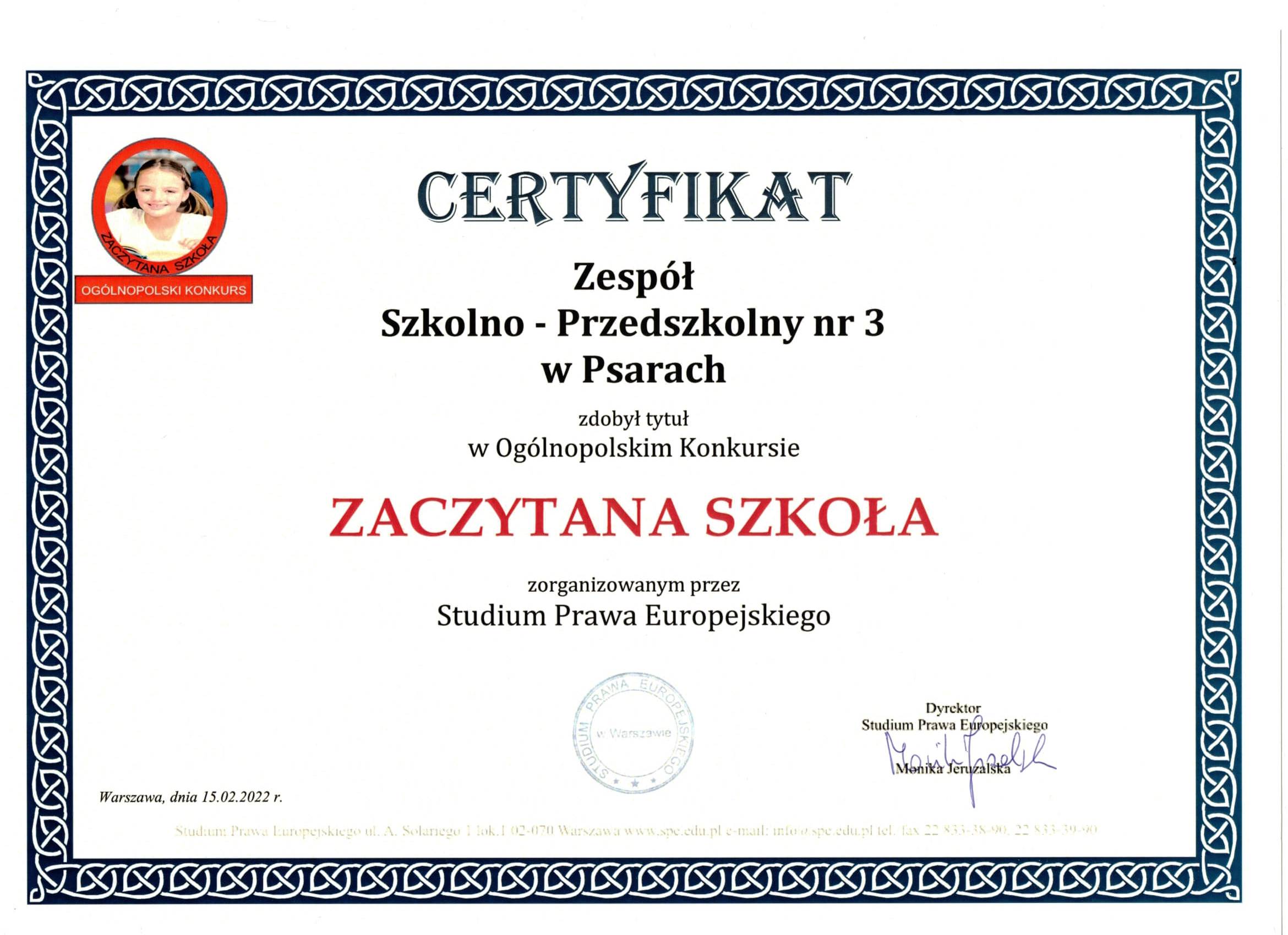 We wrześniu 2021 roku nasza szkoła przystąpiła również do XLI edycji Ogólnopolskiego Konkursu dla szkół pod nazwą „Zaczytana szkoła” organizowanego przez Studium Prawa Europejskiego w Warszawie. Celem konkursu było rozwijanie czytelnictwa u dzieci i młodzieży w wieku szkolnym. Konkurs trwał od 15 września 2021 r. do 15 lutego 2022 r. W tym czasie należało wykonać określone regulaminem zadania, których wykonanie było oceniane przez jury organizatora konkursu.