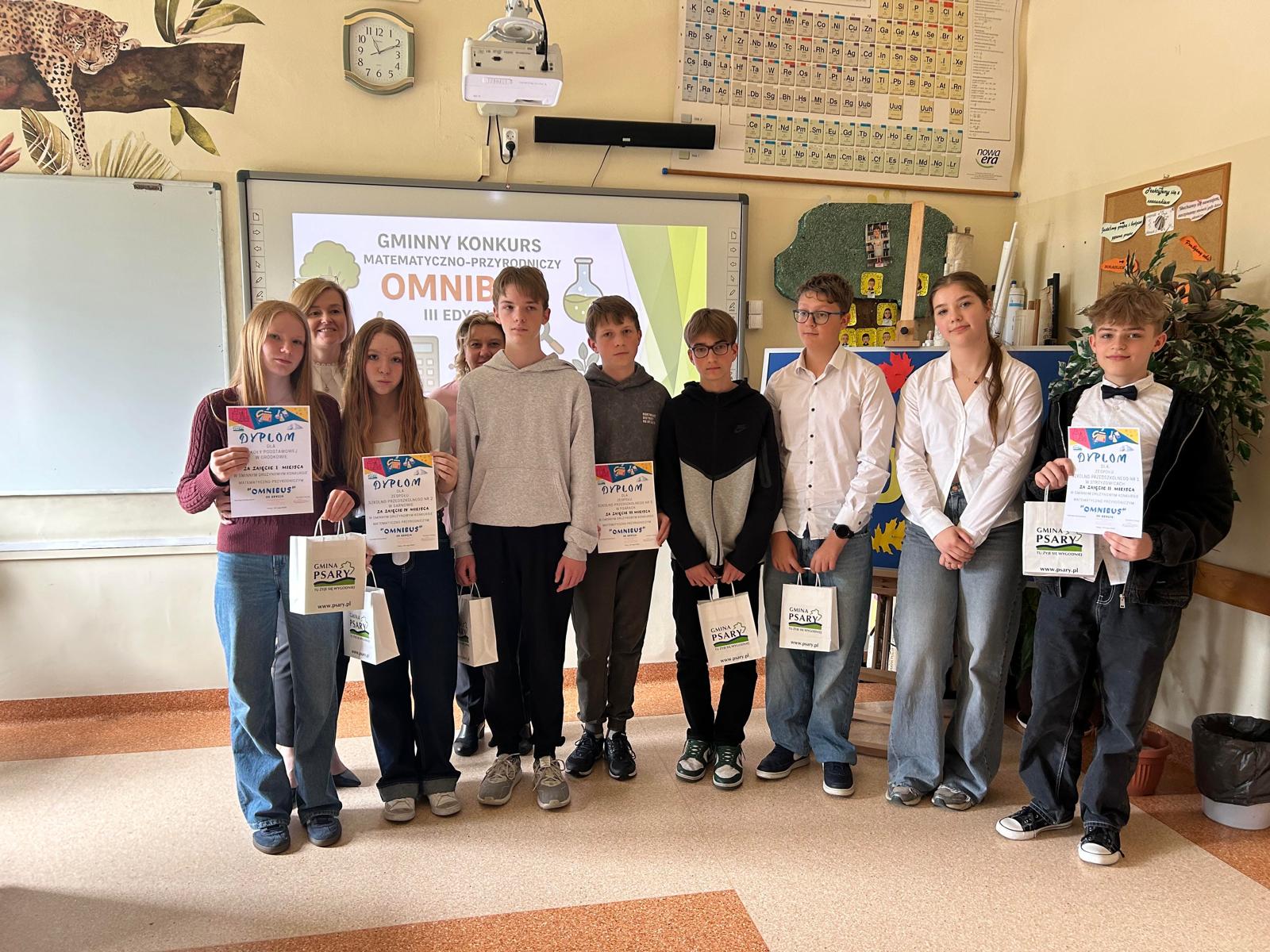 29 maja 2025 roku w Szkole Podstawowej w Psarach odbyła się III edycja Drużynowego Gminnego Konkursu matematyczno-przyrodniczego "Omnibus". Uczniowie z klas siódmych zmagali się z zadaniami o różnym stopniu trudności z zakresu podstawy programowej. Zagadnienia dotyczyły wiedzy zdobywanej na lekcjach oraz jej praktycznemu wykorzystywaniu w życiu.